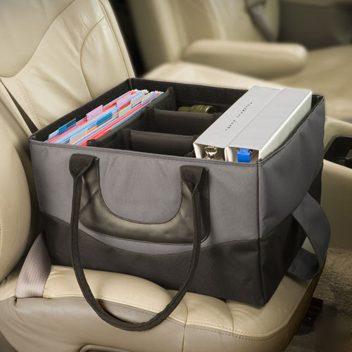 With the Auto Exec File Tote by Go Office, you will stay on the cutting edge of business even on the road. This compact tote is lightweight and easy to use. With 4 adjustable divided sections, this organizer is a must-have for mobile workers who need a great deal of filing space to keep papers neat and efficient. The dividers feature double-sided Velcro to keep them in place. Made of durable 600 denier luggage material, this tote was built to last. The puncture-proof walls and bottom provide stability and long lasting durability. The Auto Exec comes equipped with a long thick carrying strap for comfortable toting as well as a removable lid to keep items safely contained. The tote can be secured to the seat by inserting the seat belt through the specially designed loop for even more hassle-free convenience. Features: