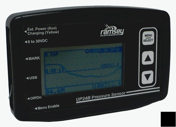 While the UP24 is small enough to be kept in your coat pocket it boasts a large 2.78" x 1.53" 128x64 pixel LCD display screen making viewing easy. Display modes include both realtime pressure and elevation graphs as well as pressure and elevation statistics. There are 12 user selectable sample rates from 1/10th of a second all the way up to every 15 minutes.