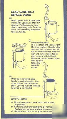 * READ CAREFULLY BEFORE USING:1.- INSTALL OPENER SHAFT IN BASE PLATE WITH HANDLE UPRIGHT, AS SHOWN IN DIAGRAM. POSITION CAN ON BASE PLATE UNDER CUTTING KNIFE PUNCTURE TOP OF CAN BY EXERTING DOWNWARD FORCE ON HANDLE...2.- LOWER HANDLE PARALEL TO TOP OF CAN AND CRANK TO RIGHT. CONTINUE ROTATION OF HANDLE WHILE CAN TURNS UNTIL TOP IS REMOVED WITH EASE AND SMOOTHNESS. GEAR DESIGN AND MOTION RAISES TOP FOR EASY REMOVAL WITH LEFT HAND. MOTE: CARE SHOULD BE TAKEN TO PREVENT TOP FROM FAILING INTO CONTENTS OF CAN....3.- ONCE TOP IS REMOVED RAISE HANDLE TO VERTICAL POSITION.REMOVE OPENER SHAFT FROM BASE PLATE. OPENED CAN WITH CONTENTS NOW FREE TO BE HANDLED