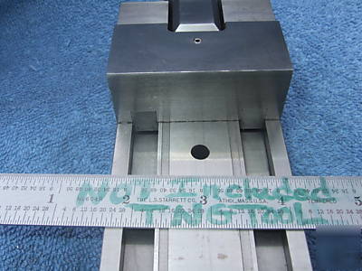 TOOLMAKER MADE DOVE-TAIL SINE (5.0" CENTERS ON GROUND RADII) GRINDING VISE IN AS CLOSE TO MINT AS YOU WILL FIND FOR A TOOL THAT IS USED DAILY IN SURFACE GRINDING OR INSPECTION !!!!!! A-2 AIR-HARDENED TOOL STEEL FOR ALMOST ALL OF THESE VISES NONE BETTER!!! THIS ONE EVEN HAS BRONZE BUSHING INSIDE THE ALUMINUM HANDLE FOR SILKY SMOOTH OPERATION WOW!!!! THEY DO NOT MAKE THEM LIKE THIS ANYMORE!!!!!!!!!!! DOVE-TAIL GRINDING VISE AS SHOWN IN VERY GOOD USED CONDITION. VISE WAS MADE IN THE 90 'S AND HAS AN ENCLOSED SCREW THAT NEVER COMES OUT OF HANDLE FOR DUST TO SETTLE ON. VERY NICELY MADE, ONLY OUR OWN DOVE-TAIL SINE VISES ARE NICER. VISE MEASURES 2.499" WIDE x 2.262" TALL AND IS 6.04" LONG. THE JAW DEPTH IS 1.001" OR ALMOST 1" WITH A WORK CAPACITY OF 2.5". VISE WAS STORED IN A GERSTNER BOX SOON TO BE LISTED AND HAS NO STAINING . IT WAS HARDLY USED. EXCELLENT USEFULL TOOL FOR SURFACE GRINDER OR AS NEEDED. WE HAVE USED VISE'S JUST LIKE THESE FOR MANY INSPECTIONS AND ON A JIG-GRINDER,SURFACE GRINDER AND EDM, THEY WORK VERY WELL.