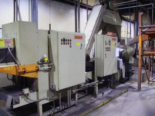 WET PARTS ARE RECEIVED AT THE LOAD END OF THE MACHINE AND TRANSFERRED BY THE CONVEYOR TOWARD THE DISCHARGE END OF THE DRYER. AS THE WET PARTS ARE CARRIED THROUGH, HEATED AIR IS CIRCULATED OVER THE PARTS BY A LARGE CENTRIFUGAL BLOWER. FOR ECONOMY, THE HOT AIR IS RECIRCULATED THROUGH THE DRYER SEVERAL TIMES BEFORE IT IS DRAWN OUT BY A SECOND CENTRIFUGAL BLOWER.