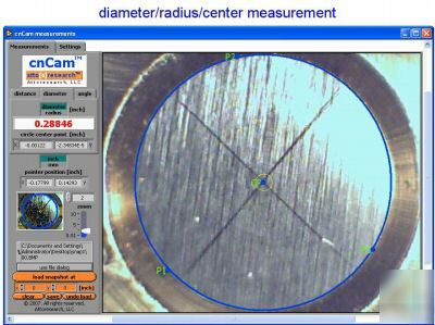 In spite of its internal sophistication the cnCam software is very easy to use. Just position the pointer over a specific point in the image and at any zoom level you will get optically corrected coordinates of that point. Both inch and mm results can be displayed and there is no confusion as to which unit is selected. Two mouse clicks give you a distance between two points. Three clicks give you a circle and the circle's diameter or radius and the center point are computed. Four clicks specify two lines and the angle between the two lines is measured. For any of your measurement defining points you can perfect their coordinates by holding the keyboard buttons 1 through 4 as modifiers (just the way you use a shift key) and clicking again.