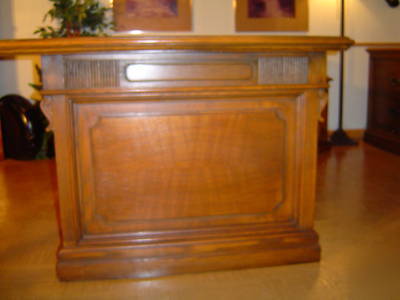 Vintage Romweber oak executive desk and credenza. Both in very good condition. The desk has a large top that has rounded edges. Secretaries pull out in front of desk and two others pull out stations. Adjustable dividers inside drawers as well as wood filing slots. Comes with original keys to lock the desk and credenza. The desktop is 45 1/2 x 86 and the credenza is 92x20 .