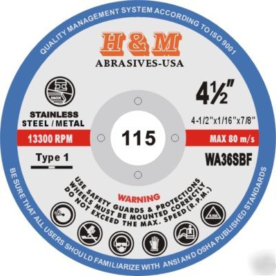 H&Mabrasives-USA'S Cut-off Wheels are manufactured in accordance with ANSI safety requirement and ISO9001 standard. They are specially designed for aggressive removal of materials without loading and very fast stock removal on metal and stainless steel. All of them are externally reinforced with layers of fiberglass for maximum safety, and can reduce cutting time 50%, require less force and provide vibration-free cutting, no burring to avoid rework.