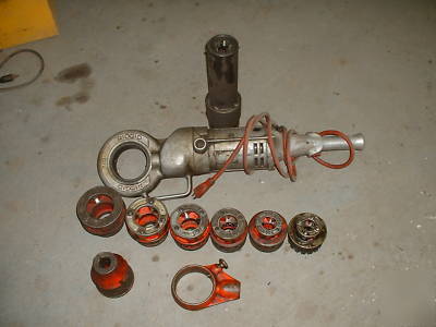 The dies have a couple broken teeth but all still work well. Also included an adaptor for other ridgid accessories, and an extension to hold bolt dies for cleaning anchor bolts. also includes a hand held head without the handle. Works well , just dont need it any more. Thank you for looking.