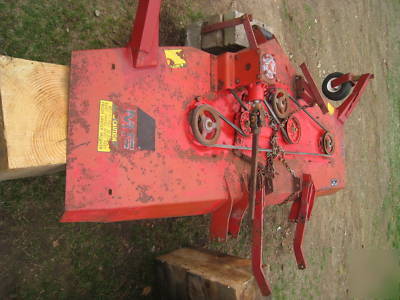 This is a triple blade mower deck. The blades and belt look in great condition and everything spins fine. I took the guards off in some pics to show off the bearings. The one guard that covers the knucle rubs against the knucle when it spins because the cover is a little bent i think but could be bent back or something. Not a big deal but I just wanted to mention it. It does not have the typical 3 point hitch setup and the gearbox is offset as the pics show so I think this was made for a mid pto or something but i'm not sure. Ive never used it. I suppose it could be modified to a 3 pt hitch by relocating the gearbox and adding the appropriate 3pt stuff but you'll have to decide. It has two exmark wheels that are just slipped in the sleaves and I'm not sure how they attach but you folks can figure it out. Other than that I've tried to describe this the best I can but please ask questions and i'll do the best I can to answer them. I can deliver 100 mile radius for $2.00 a mile prepaid. Thanks