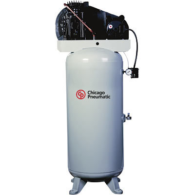 The Chicago Pneumatic air compressor is ready to run; just hook up to electricity and get started. Features a solid cast iron cylinder, start/stop pressure control. Choose the size and configuration to fit your application. U.S.A. Max. PSI: 165, Volts: 208/230, HP: 5, Air Tank Size (gal.): 60, Tank Description: Vertical, Air Outlet Size (in.): 1/2, Portable or Stationary: Stationary, Dimensions L x W x H (in.): 29 x 20 x 68