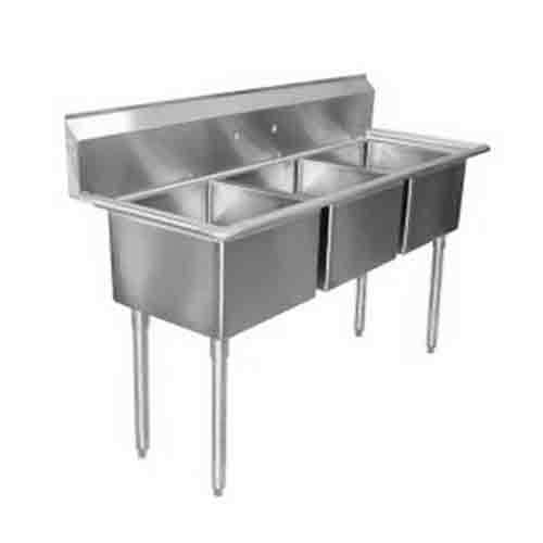 Standard 3-Compartment Sink, no drainboard, 24" wide x 24" front-to-back x 14" deep bowls, 9" backsplash, 16/304 s/s top & bowl, galvanized legs with adjustable plastic feet, raised 1-1/2" rolled edge, includes 1-1/2" basket strainer (Flyer Pricing)