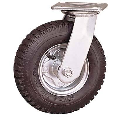 300-lb. capacity pneumatic caster with heavy duty zinc-plated steel wheel. Rubber tire inflates to 30 PSI and wheels have 1/2in. bore, 6in x 2in. wheels come with brass valve stem and feature mounting height of 7 3/4in.