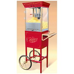 Modeled after antique popcorn carts of the early 1900s, this full-sized popcorn cart pops up to 1-1/2 gallons of movie-house-quality popcorn per batch. Its large, stainless-steel kettle features dual-hinged lids, a built-in stirring system, and a kernel catcher to keep out unpopped kernels. The traditional hot-oil popper sits on top of a full-size working cart, which includes two 16-inch solid-core tires with gold-spoked wheels for easy maneuverability. There's also a compartment in the base of the unit for storage and a supplies compartment to help keep the cart well stocked and looking tidy. Easy to use, easy to clean, and fun to watch, the popper makes for a nice addition to home theater rooms, game rooms, or parties, and is approved for commercial use. The full-size popper measures 16 by 19 by 60 inches and carries a 90-day warranty.