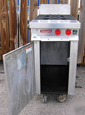 Vulcan 2 burner range, natural gas, 30,000 btu per burner. All stainless steel exterior, bottom storage base, overall measurements are 39" deep x 17" wide (plus gas pipe), comes on casters . Unit is used, but in very good working condition, exterior is clean and ready to use. Comes with 60 day parts warranty.