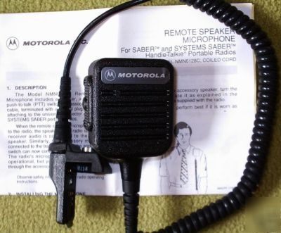 This Motorola Universal Remote Speaker Mic (Model: NMN6128C) is brand new. It works for all Systems Saber, Saber Motorola radios. It allows you to talk and listen without removing the radio from the belt, case or charger. Ideal for high noise level environments. This water resistant microphone includes: 6.0' Coiled Cord Assembly, and Swivel Clip. This item is $151.00 new. This mic has been sitting in a warehouse with multiple others and has some damage to the cord protectors but it still works like I described. A great product for all types of services.