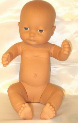 Slightly smaller than lifesize new born baby model (height 15"). Head, arms and legs movable.