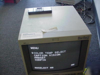 On-screen menu in five languagesKnob controls of Brightness Contrast Aperture Phase Chroma and VolumeIzzitOn( System provides visual recording confirmationRGB Split Screen (two RGB inputs)Analog RGB Y/C and composite video IN/OUT (loop-through) connectorsHigh Resolution 13" Trinitron picture tubeImproved frequency response (10.0 MHz RGB equivalent to 800 TVL)Splash-proof panels protect against liquidsFront Panel Cover prevents inadvertent operationThree scan modesRS-232C controlAutomatic selection of standard color systems: NTSC and PALUL-2601-1 ClassifiedThe underscan feature provides 5% underscan for a full view of the image edge-to-edge. Overscan provides 20% overscan of the images for a slightly magnified view.Located for easy viewing at the upper center of the monitor's bezel the Status Light illuminates to indicate that image recording is activated. For example the Status Light can be configured with the Sony SVO-9500MD S-VHS Videocassette Recorder/Player to indicate that recording is ongoing.Additionally the PVM 53 Series Status Light feature is compatible with any Sony device (recorder printer or storage unit) which incorporates a simple contact switch closure-type control option. Designated devices are those that offer the FS-20 Footswitch RM-81 or RM-91 Remote Control Units as optional accessories. Note that the SME-PVMSTATSVO cable is required to activate the Status Light.Detachable panels fit over the front panel area and at the vents located at the sides of the monitor to provide an easy-to-clean surface.Set Chrome Color Temperature Closed Caption or create customized parameter settings.Adjust image values via knob controls or set at detent for calibration with other monitors in the video systemView on-screen menu commands in English German French Italian or SpanishLoop-through provided for all video signals with signal type selectable from front panel. In addition two RGB input signals are provided.View two RGB input signals split top-half (RGB A) and bottom-half (RGB B) for comparison or color calibration.Provides EIA 525/60 or CCIR 625/50 (auto selectable) with worldwide signal acceptance versatility and multiple-system capability.Feed audio signal from audio output of a VCR or microphone (through an optional microphone amplifier).Color System: NTSC PALAperture correction: 0dB to <+->6.0dbFrequency response: LINE 9.0 MHz (-3dB)RGB 10.0 MHz (-3dB) (equivalent to 800 TV lines)Synchronization: AFC time constant 1.0 msec.Overscan: 20% overscan of CRT effective screen areaNormal scan: 7% overscan of CRT effective screen areaUnderscan: 5% underscan of CRT effective screen areaPicture Tube Resolution: 600 TV linesCRT: SMPTE-C phosphorColor temperature: 6500K/9300K/USER(3200K-10000K factory setting is 6500K)Maximum Diagonal viewable area: 13"Y/C IN: 4-pin mini DIN connectorVIDEO IN: BNC connector1V p-p <+->6dB sync negativeAUDIO IN: phonojack -5dBu more than 47kohmsR/R-YG/YB/B-Y IN: BNC connectorRGB channels: 0.7V p-p <+->6dBSync on green: 0.3 V p-p negative 75 ohms terminatedR-YB-Y channels: 0.7 V p-p<+->6dBY-channel: 0.7 V p-p <+->6dB(Standard color bar signal of 75% chrominance)EXT SYNC IN: BNC connectorComposite sync 4V p-p<+->6dB negativeY/C OUT: 4-pin mini DIN connectorVIDEO OUT: BNC connector 75 ohms terminatedAUDIO OUT: phonojack Output level 0.8WR/R-YG/YB/B-Y OUT: BNC connector 75 ohms terminatedEXT SYNC OUT: BNC connector 75 ohms terminatedREMOTE: 8-pin mini-DIN connectorRS-232C: 9-pin D-SUB connectorPower consumption: Approx. 90WPower requirements: 120V AC 50/60 HzOperating temperature: 0-35CStorage temperature: -10 to +40CHumidity: 0-90%Compliance: UL 2601-1 ClassifiedDimensions: Approx. 346x340x411.5mm (w/h/d)(13 5/8 x 13 1/2 x 16 1/4 inches) not including projecting parts and controlsWeight: Approx. 16.7kg (36lbs 14oz.)